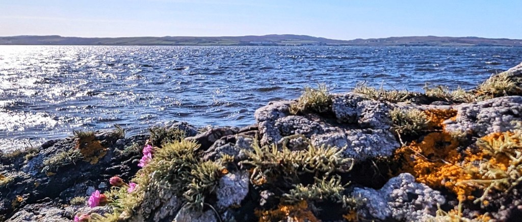 Only while we were talking to the owner of the ram, we noticed a little green gate with “Currie Sands” written on them. They would have preferred us to park on the neatly cut grass instead of their private parking gravel, but it is okay for us to leave the car and head down to the little beach. Behind the green gate, a narrow and not particularly distinct path leads down a steep hill to a white sandy beach. Unexpectedly white for a Scottish beach. If it were not for the temperature, we might have thought we had just stepped through a portal and ended up in Hawaii.