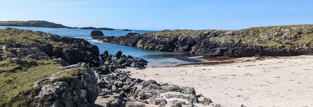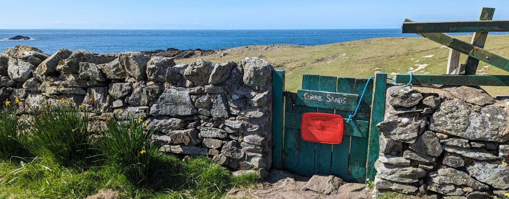 With the weather we were having, it was not a big problem to walk a bit, although any seals and whales were having a bank holiday or out for brunch or something. No problem, the weather was here and things were beautiful anyway. We had heard of a little green gate leading to a place Currie Sands a mile and a half up the road, so we decided to divert our attention, turned right at the church towards Tormisdale and, after the Islay Celtic Craft Shop, took the first left onto another, even more narrow yet newly paved road, which led to as close as Canada as we physically could. I.e. the Western most part of Islay.